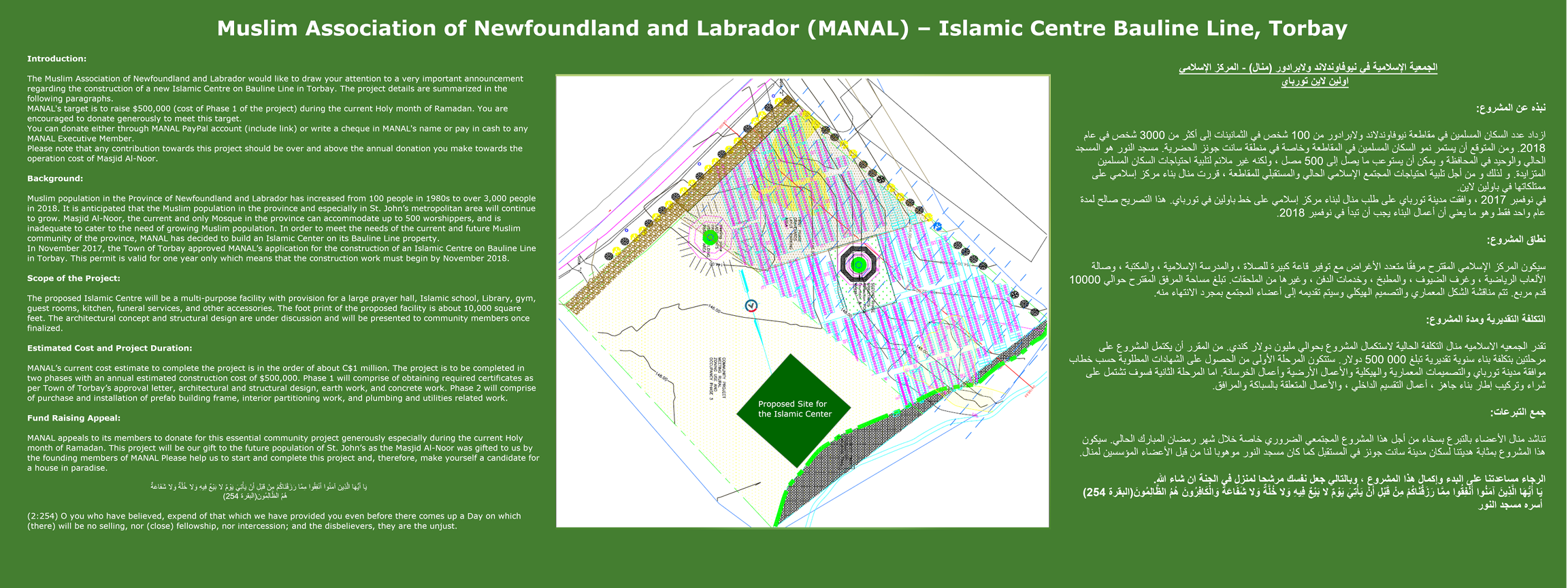 The Muslim Association of Newfoundland and Labrador would like to draw your attention to a very important announcement regarding the construction of a new Islamic Centre on Bauline Line in Torbay. The project details are summarized in the following paragraphs.